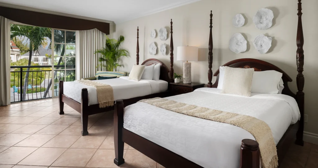 Sandals Resorts offer only one king bed in all of their rooms.  However, we can request a rollaway for your room.  If two beds are important to you, please consider one of our trips to Beaches Turks and Caicos. Beaches Turks and Caicos rooms offer both king beds and double queen bed rooms.